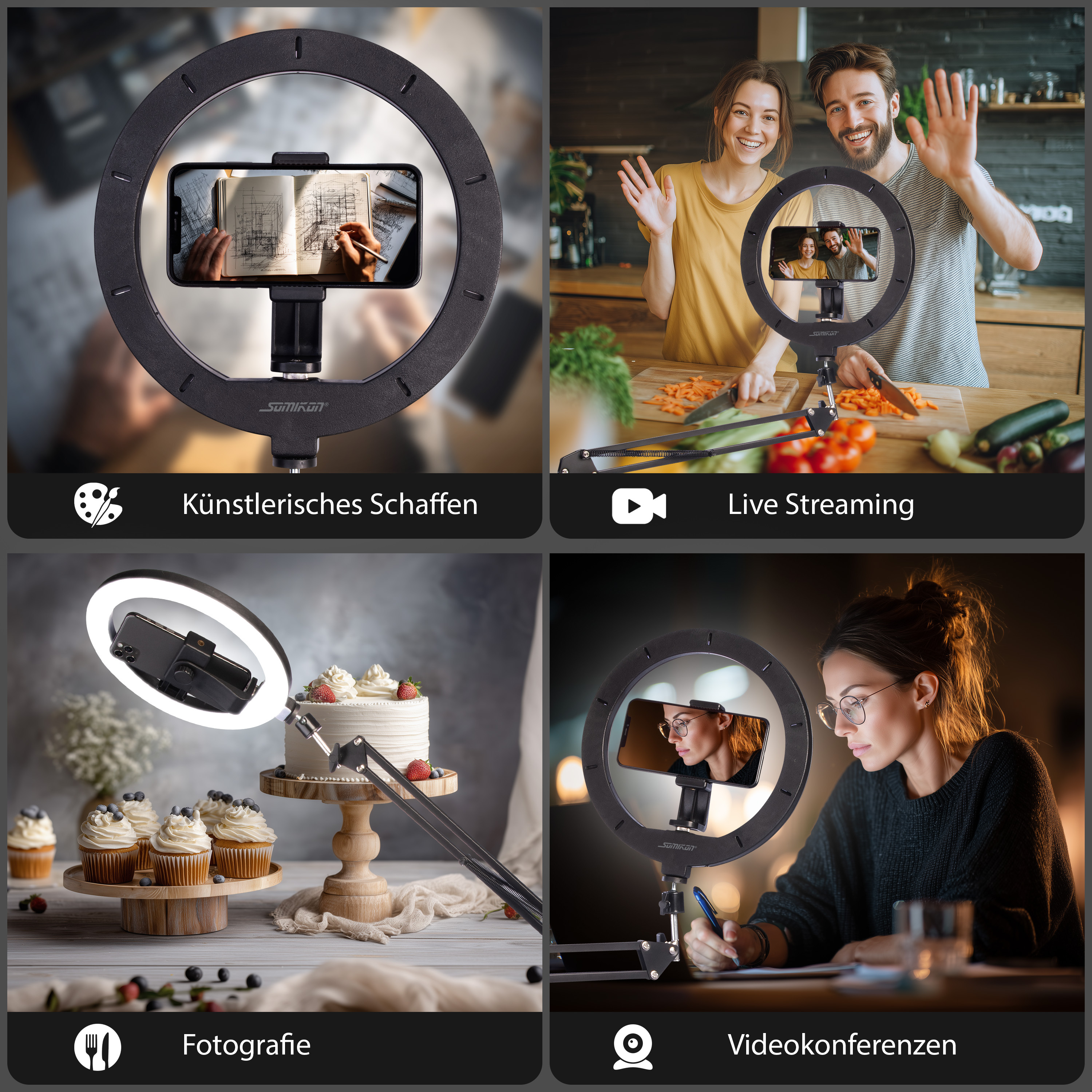 Ein 10-Zoll-Ringlicht auf einem stabilen Overhead-Stativ verwandelt jedes Smartphone in einen praktischen Dokumentenscanner. Dazu genügt es, das Gerät direkt über dem Blatt zu positionieren – der gleichmäßig leuchtende Ring sorgt für klare, schattenfreie Ergebnisse, egal ob Verträge, Belege oder Zeichnungen erfasst werden sollen. Damit eignet sich das System gleichermaßen für Büro, Schule und Homeoffice, überall dort, wo jedes Detail zählt.