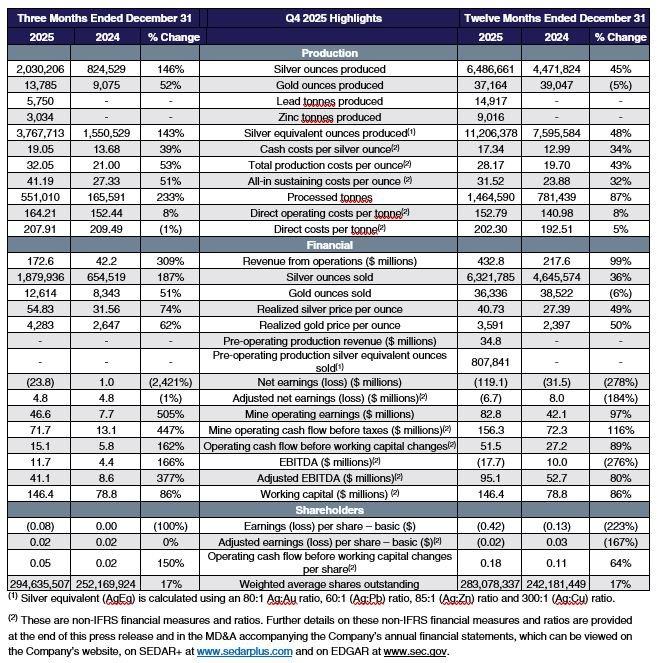 • Significant Year-Over-Year Production Growth: In 2025, the Company produced 6,486,661 ounces (“oz”) of silver and 37,164 oz of gold. Including base metal production, total silver equivalent (“AgEq”)(1) production reached 11.2 million ounces, marking a 48% increase over 2024, driven by output from the newly commissioned Terronera mine and the acquired Kolpa mine.