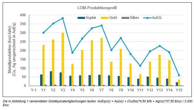 Gemäß der PEA erreicht die Metallproduktion in den ersten drei Betriebsjahren ihren Höhepunkt mit maximal 382,6 koz AuEq im dritten Produktionsjahr, bestehend aus 299,8 koz Gold und 54,2 Mio. lbs Kupfer. Die durchschnittliche Produktion über die gesamte Lebensdauer der Mine beträgt 245,6 Mio. Unzen Goldäquivalent, bestehend aus 183,2 Tausend Unzen Gold und 40,4 Millionen Pfund Kupfer pro Jahr bei einem durchschnittlichen Gehalt von 0,62 g/t Goldäquivalent mit 0,44 g/t Gold und 0,16 % Kupfer.