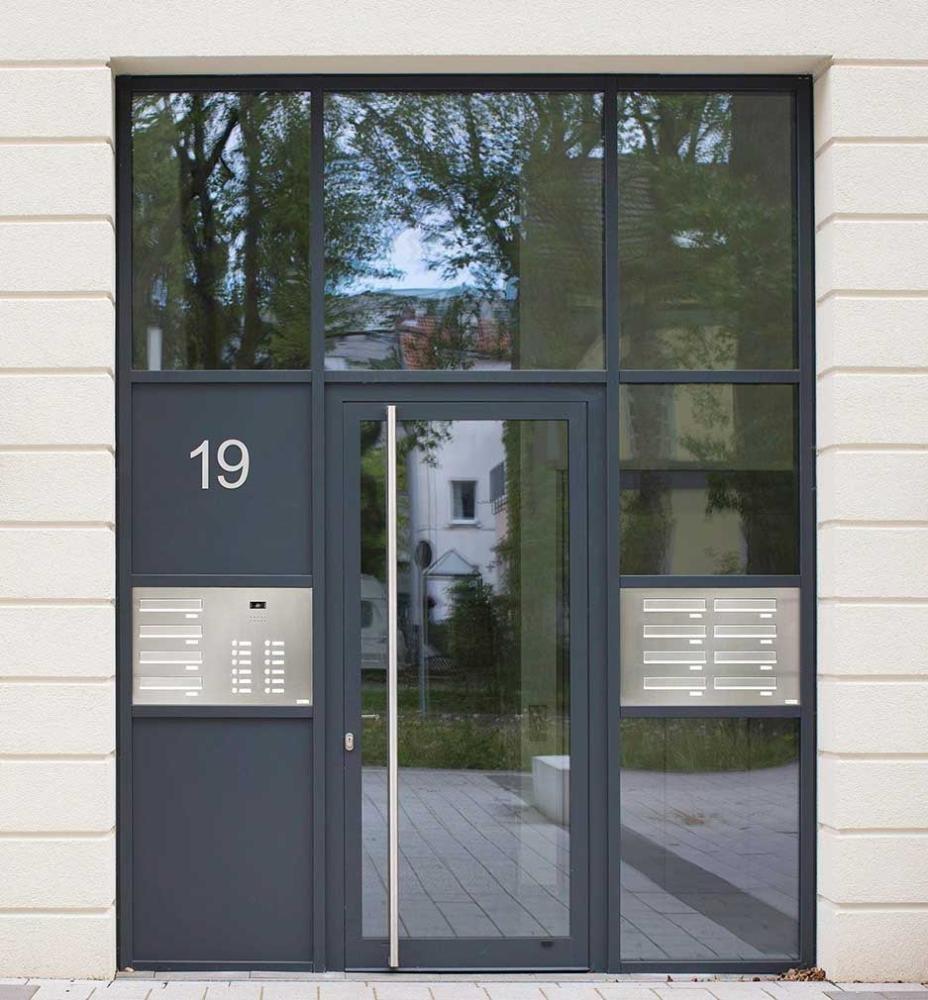 Briefkastenanlagen als Türseitenteil verbinden funktionale Anforderungen mit einer klaren architektonischen Lösung. Sie bilden eine geschlossene Einheit mit der Eingangstür und schaffen eine aufgeräumte Front im Hauseingang. Die Anlagen werden individuell gefertigt und sind sowohl für moderne als auch für klassische Gebäude geeignet. Klingelanlage, Videosprechanlage, Beleuchtung und Namensschilder lassen sich stimmig integrieren.