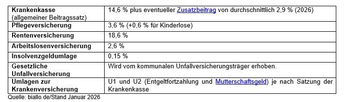 Sozialabgaben und Co: Zusätzlich sind Sozialabgaben zu leisten. Welche, das zeigt die Tabelle 1.