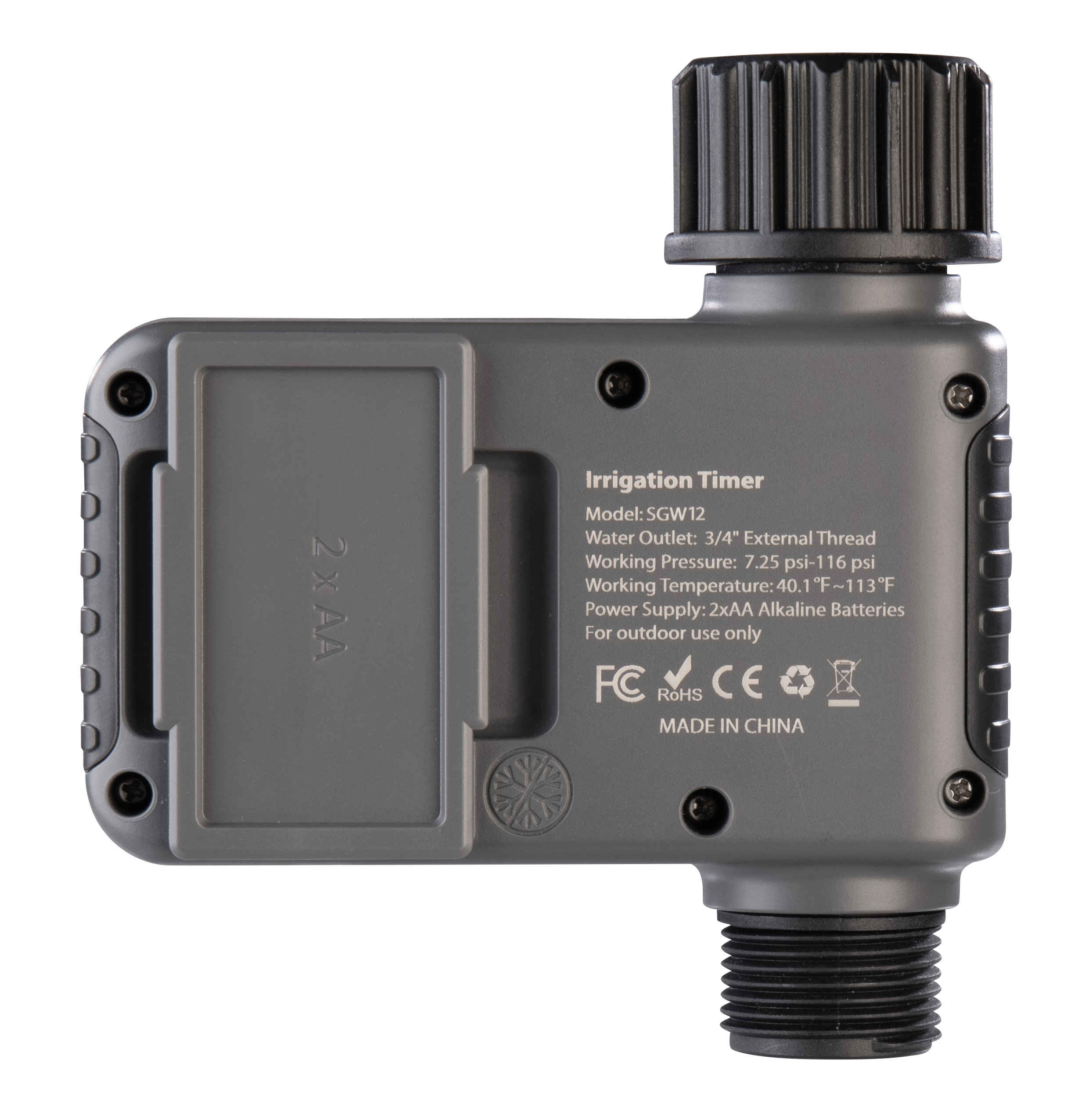 - Stromversorgung Bewässerungscomputer: 2 Batterien Typ AA / Mignon für bis zu 6 Monate Laufzeit (bitte dazu bestellen), Fernbedienung: 1 Batterie 23 A 12 V (enthalten)