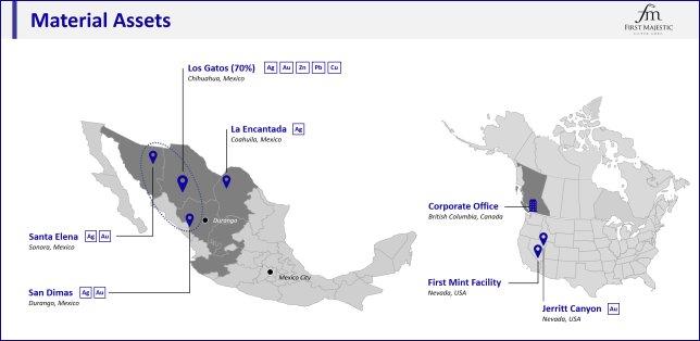 First Majestic ist ein börsennotiertes Bergbauunternehmen, dessen Hauptaugenmerk auf der Silber- und Goldproduktion in Mexiko und den USA liegt. Das Unternehmen besitzt und betreibt vier aktive Untertageminen in Mexiko – die Silber-/Goldmine Santa Elena, die Silbermine Los Gatos (das Unternehmen ist zu 70 % an dem Besitzer und Betreiber der Mine, dem Joint Venture Los Gatos, beteiligt, die Silber-/Goldmine San Dimas und die Silbermine La Encantada – sowie ein Portfolio von Erschließungs- und Explorationsassets, einschließlich der Goldmine Jerritt Canyon im Nordosten von Nevada (USA).