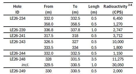 - LE26-241 (100 m east of LE26-248): Intersected strongly elevated radioactivity in the lower 8 m of sandstone above the unconformity at 325.9 m, including 3,712 cps over 0.5 m.