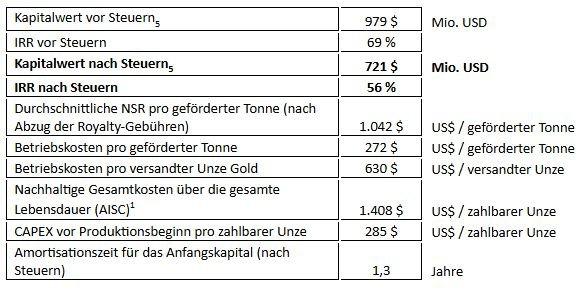 Das Unternehmen hat in dieser Pressemitteilung auf bestimmte Finanzkennzahlen oder -kennziffern Bezug genommen, darunter die „All-in-Sustaining-Kosten pro Unze“, die nach den internationalen Rechnungslegungsvorschriften („IFRS“) nicht anerkannt sind und dementsprechend Nicht-GAAP-Finanzkennzahlen darstellen. Diese Kennzahlen und Kennziffern haben nach den IFRS keine standardisierte Bedeutung und sind daher möglicherweise nicht mit ähnlichen Kennzahlen vergleichbar, die von anderen Unternehmen ausgewiesen werden. Das Unternehmen hat diese Kennzahlen aufgenommen, um zusätzliche Informationen bereitzustellen; sie sollten jedoch nicht isoliert betrachtet werden, sondern im Zusammenhang mit dem Jahresabschluss des Unternehmens und den darin enthaltenen Kennzahlen. Das Unternehmen ist der Ansicht, dass die Kennzahl „All-in-Sustaining-Cost“ die bestehenden, vom Unternehmen gemeldeten IFRS-Kennzahlen und -Kennziffern ergänzt und Investoren zusätzliche Informationen zur Bewertung des Unternehmens liefert. Die nachhaltigen Gesamtkosten (AISC) werden berechnet, indem die operativen Cash-Kosten einer Mine zu ihren laufenden nachhaltigen Investitionskosten addiert werden, wie z. B. der Ersatz von Ausrüstung und die fortschreitende Erschließung der Mine, um das gesamte Ausmaß der abzubauenden Mineralisierung zu erschließen, die zur Aufrechterhaltung des Produktionsniveaus erforderlich sind. Durch die Einbeziehung von Aufbereitungs- und Veredelungskosten sowie der Metallausbeute bietet die nachhaltige Gesamtkosten-Kennzahl eine umfassende Kennzahl, die die gesamten wirtschaftlichen Kosten für die Produktion und den Verkauf einer Unze Gold langfristig nach Fertigstellung der Mine widerspiegelt. Da die nachhaltige Gesamtkosten-Kennzahl auf zukunftsorientierter Basis angegeben wird, ist das Unternehmen nicht in der Lage, eine quantitative Überleitung zu den am ehesten vergleichbaren historischen Kennzahlen nach IFRS vorzulegen.