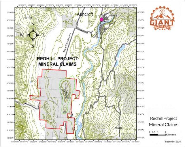 Das Konzessionsgebiet Redhill befindet sich südlich von Ashcroft, British Columbia, im Bergbaurevier Kamloops und ist über den Trans-Canada Highway erreichbar. Das Konzessionsgebiet umfasst achtzehn (18) Mineral-Claims mit einer Fläche von insgesamt ca. 4.736,38 Hektar (11.703 Acres) und stellt einen großen, zusammenhängenden Konzessionsblock in einer etablierten Bergbauregion dar.