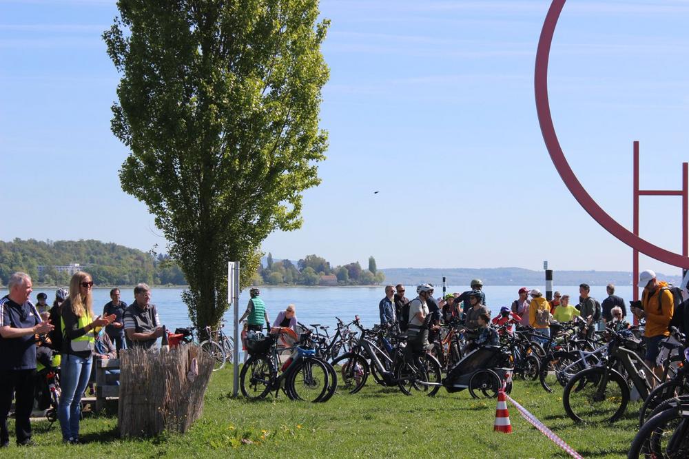 Eine frühlingsfrische Radtour für die gesamte Familie: Das grenzüberschreitende VeloPicknick Konstanz / Kreuzlingen lud am 26. April zu einer besonderen Fahrt durch die Schwesterstädte ein. Treffpunkt war um 10.30 Uhr auf Klein Venedig, wo die 350 Teilnehmenden von Fahnenschwingern und Fanfaren empfangen wurden. Nach der Begrüßung durch den Konstanzer Bürgermeister Karl Langensteiner-Schönborn und den Kreuzlinger Stadtpräsidenten Thomas Niederberger stellten sie sich auf und radelten gemeinsam, angeführt von den beiden Stadtoberhäuptern, los.