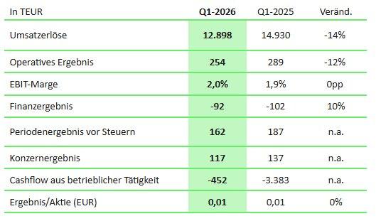 - Ausblick 2026 bestätigt: Umsatzerlöse von rund EUR 50 Mio. bei einer EBIT-Marge von 3-4 Prozent