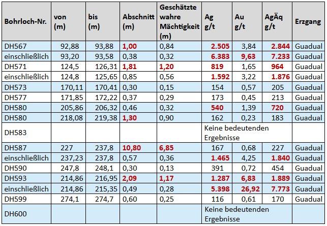– In Bohrloch DH593 wurde eine ETW von 1,17 m mit einem AgÄq-Gehalt von 1.889 g/t (1.287 g/t Ag und 6,83 g/t Au) durchteuft, was den Nachweis einer konsistenten Mineralisierung innerhalb einer laut Auswertung abtauchenden Zone liefert.