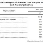 Der Quadratmeterpreis für die Verkäufe von baureifem Land beläuft sich in Bayern im Jahr 2022 im Durchschnitt auf 430 Euro. Dabei bestehen zwischen den einzelnen Regierungsbezirken große Preisunterschiede. Mit einem Preis von 1 343 Euro je Quadratmeter ist baureifes Land im Regierungsbezirk Oberbayern am Mehr