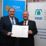 In Anerkennung seiner Verdienste für das Zahntechniker-Handwerk hat der Zentralverband des Deutschen Handwerks (ZDH) das Handwerkszeichen in Gold an VDZI-Präsident Uwe Breuer verliehen. Hans Peter Wollseifer, Präsident des Zentralverbands des Deutschen Handwerks (ZDH), hob in seiner Laudatio vor den Delegierten Mehr